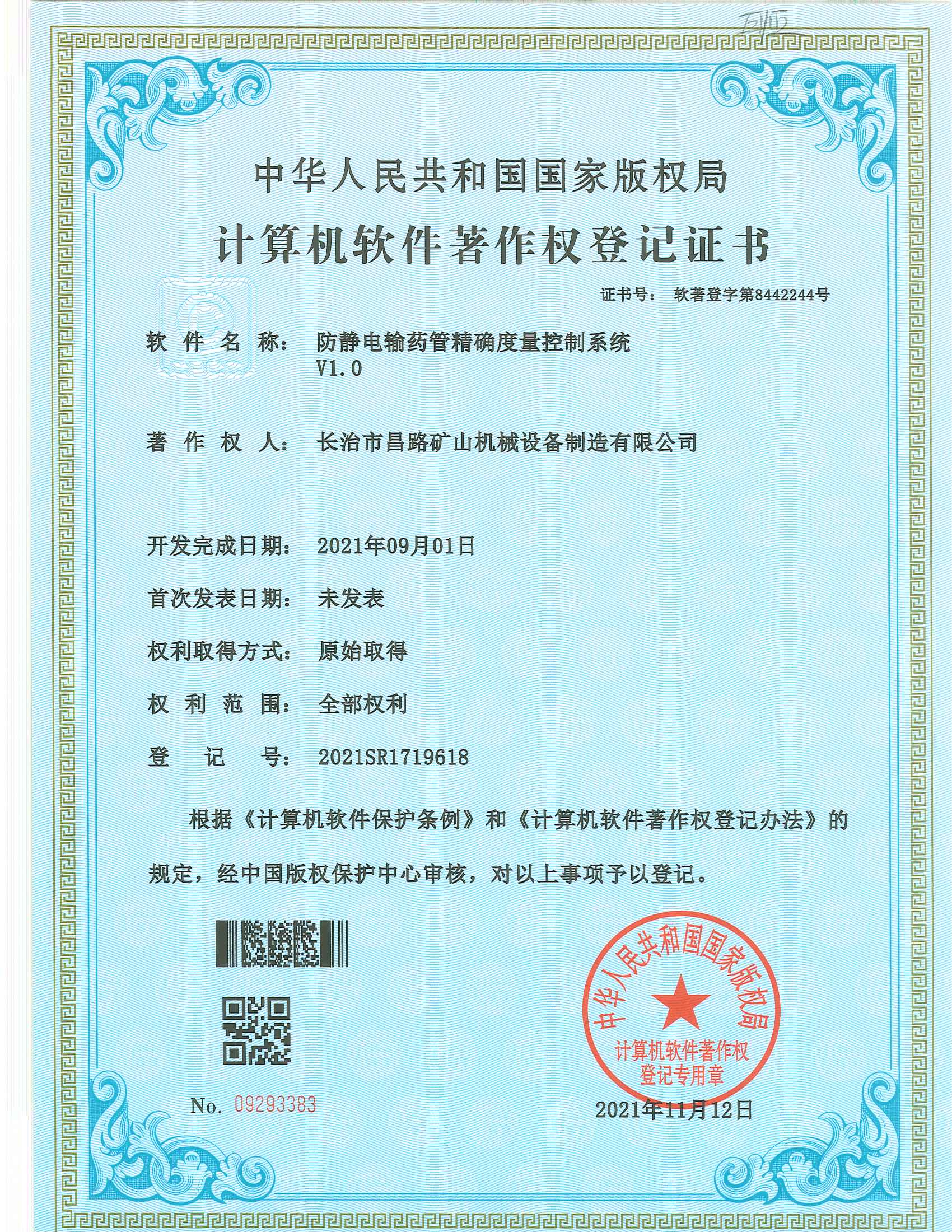 防靜電輸藥管精確量控制系統著作權登記證書